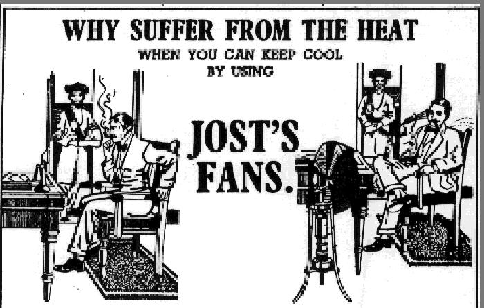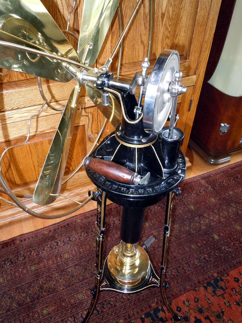First marketed around 1903 and produced for almost two decades, this very unusual design floor-standing fan made by Carl Jost uses a Stirling hot air engine to power the blades. A kerosene lamp mounted at the lower part of the elegantly decorated tripod base generates heat to drive the motor, which turnss the 20" diameter fan blades at a steady and surprisingly effective rate. Needless to say, it is an incongruous concept, using heat to generate cool air, but it was used very effectively in areas that lacked access to electricity.