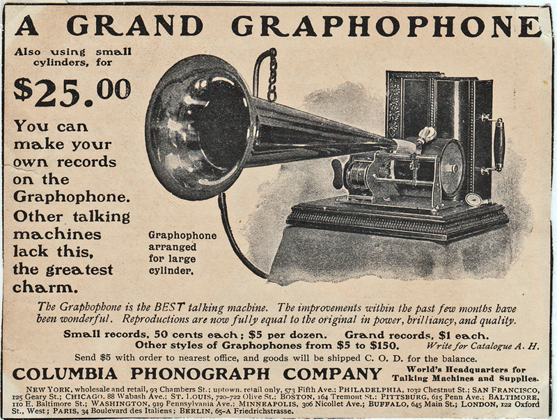 This variation of the famous Model B Graphophone shares the same tiny open works motor, upscaled to play the large 5" diameter Concert or Grand cylinders that had come on the market around 1898. However, the AB can also play conventional 2" cylinders by unscrewing the knurled nut, removing the 5" Concert mandrel, and raising the telescoping interior 2" mandrel to reach the reproducer. (See also the Columbia Type AD.) At $25 this was the cheapest machine made which could play the soon-to-become obsolete Concert records, which had dropped in price from $5 each to $1 apiece -- still a considerable sum for the time. (This phonograph was the third I ever bought, back in 1962!)
