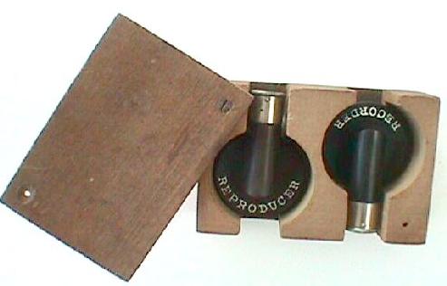 The Graphophone playing a Bell-Tainter 6" x 1-5/16" ozocerite wax cylinder, as used on the early treadle machines. The rare black gutta-percha reproducer and recorder are shown in the original wooden storage box. (Gutta-percha was replaced by aluminum in 1897.)