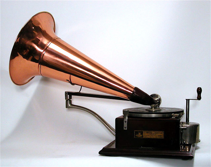 Immortalized in the painting "His Master's Voice," the Berliner 'Improved' Gramophone with its distinctive vertically-mounted crank is unquestionably the most famous phonograph in the world. The enduring image of this machine, paired with Nipper the dog in the Victor (and later RCA) trademark, gives this popular machine its nickname among today's collectors -- the Berliner Trademark. Originally offered in the U.S. in 1897, this classic style went on to be sold in Canada, England, and France up until around 1903. Only in France during the 'Belle Epoque,' however, did this classic phonograph take on an aura of true elegance, cased in dark red mahogany. Most often found with a brightly nickeled horn, some were made with a gorgeous copper horn as seen here -- infinitely richer in appearance than its more humble cousins. (Everywhere else the case was made of light oak, and the horn was either black or brass). Interestingly, the motor and reproducer were made in the United States, while the cabinet was made in England. The machine itself, however, was only marketed in France. This example of the very rare mahogany Berliner Trademark is totally original and pristine, with a highly polished finish.