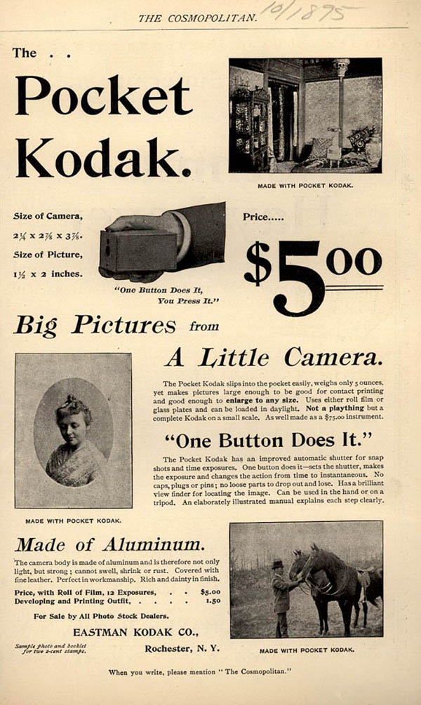 The tiny Pocket Kodak was introduced in July 1895 with either red or black leather covering, priced at $5. It was a very significant camera since it was the first Kodak to use paper-backed roll film, with a red window on the back to indicate the exposure number. These features were invented by Samuel Turner of the Boston Camera Mfg. Co. in 1892; George Eastman paid royalties to use them, until buying out Boston Camera in the summer of 1895.
