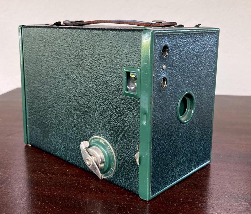 The No. 2 Brownie was made from 1901-1935. The Model F version was introduced in 1924, with an aluminum body replacing the cardboard of earlier Brownies. Color cases, such as this green one, were first offered in 1929. The winding key design was replaced by a round knob in 1931, dating this specific camera to a narrow range of 1929-1931. The camera is complete with the original 1929-dated instruction booklet.