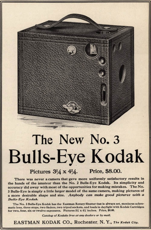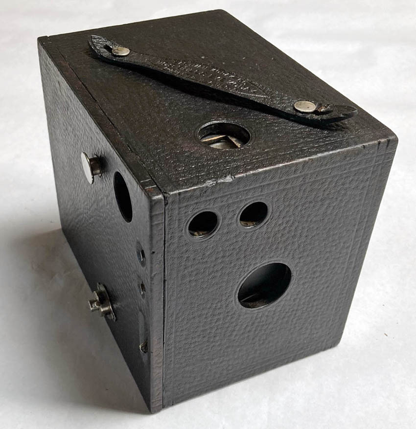 This design was an updated and somewhat simplified variation of the earlier Bulls-Eye cameras and was made from 1908-1913. It has a fixed focus lens that gives clear images from 8 feet to infinity. It was a semi-upscale “fool proof” version of a box camera, made with wooden case and genuine leather covering rather than cardboard and leatherette. It took 3¼” x 4¼” pictures on 124 film (discontinued in 1961). The original price was $8, when a Brownie box camera cost $3.