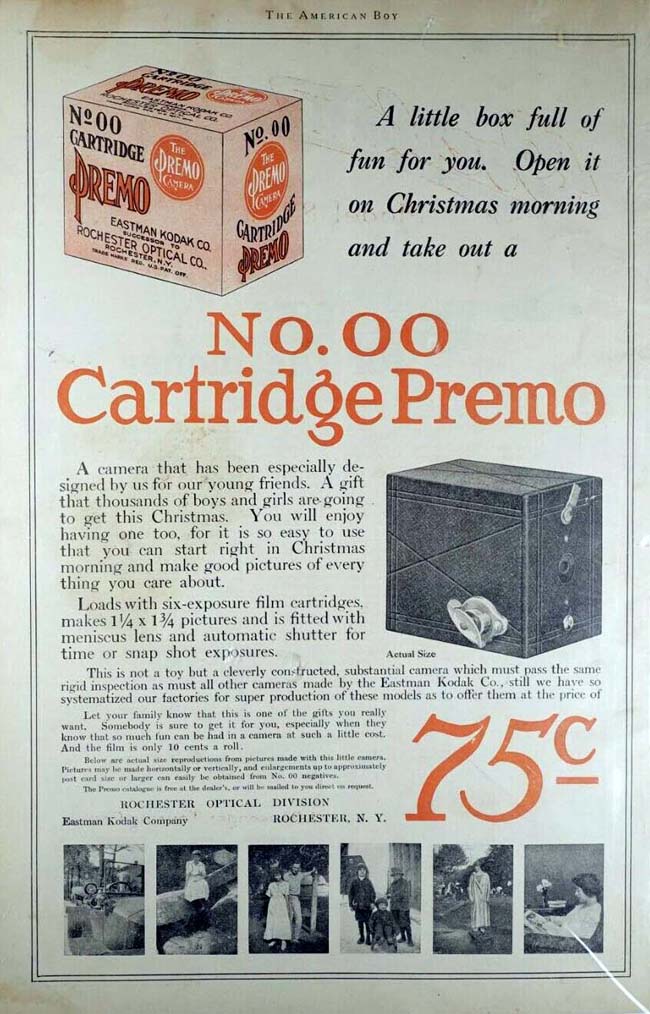 The Premo 00 was sold from 1916 to 1922, initially priced at only 75c (raised to $1 in 1918). It used paper-backed unperforated 35mm film, yielding 6 exposures per roll at 1¼ x 1¾” in size. These rolls originally cost 10c.