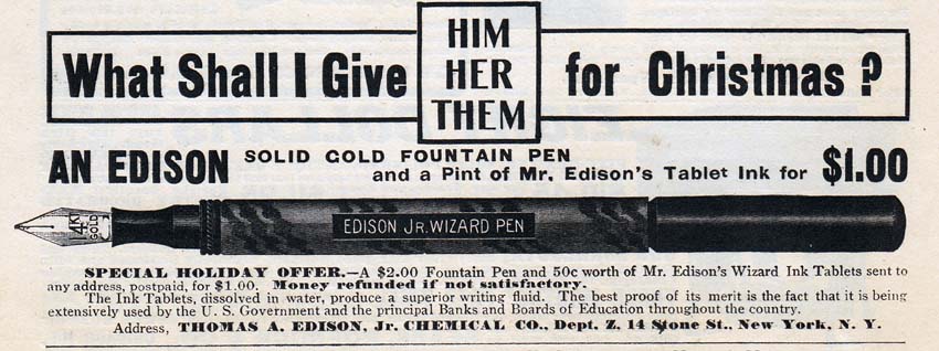 This original package of Wizard Ink Tablets is still full and complete with instructions. (However, over the last 100 years the tablets have deteriorated into powder.) Is it any good? A very tiny sample quantity proved to make good, dark, useable ink, but despite the advertising claims that "ink made from the Edison, Jr. Wizard Ink Tablet will neither sour nor mould," the ink was coated in mold in 3 days time!