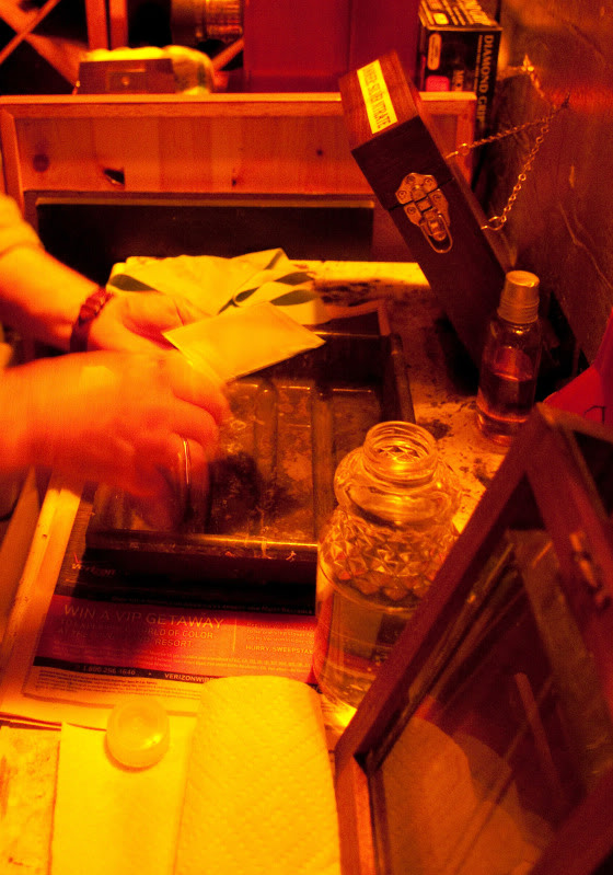 The rest can be done under normal light. The negative image is placed in a holder and smoothly plunged into a solution of potassium cyanide. (Yes, it's very dangerous.)
