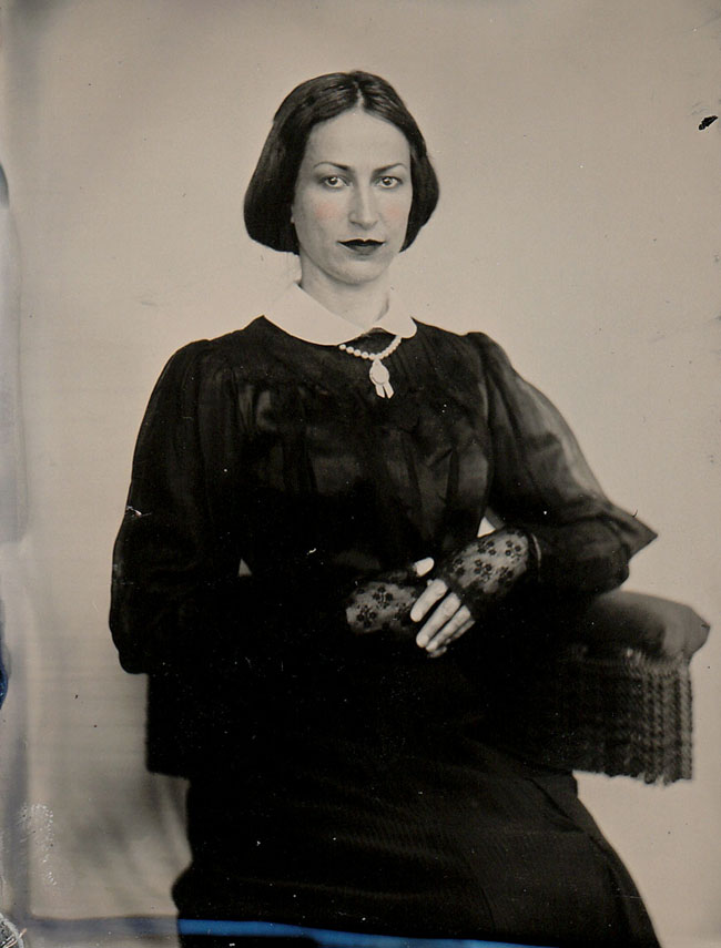 As soon as it has cleared it must be removed from the cyanide or it will begin to disintegrate. Then it is thoroughly washed in clean water and allowed to air dry. The final step is to flow sandarac varnish onto the surface to protect the silver and prevent it from tarnishing, and quickly drying the varnish over a very hot kerosene lamp -- hopefully with no dust landing smack-dab in the center of the sitter's face. Properly done, this rapid heating causes the varnish to level out and yield a smooth, hard protective coating. When using a glass substrate for an ambrotype, great care must be exercised to avoid overheating and shattering the glass. Voilà, a finished portrait: