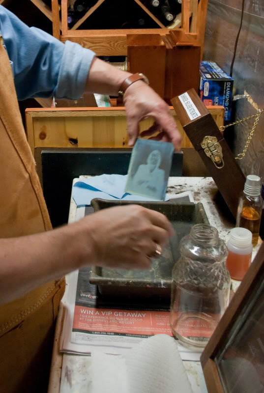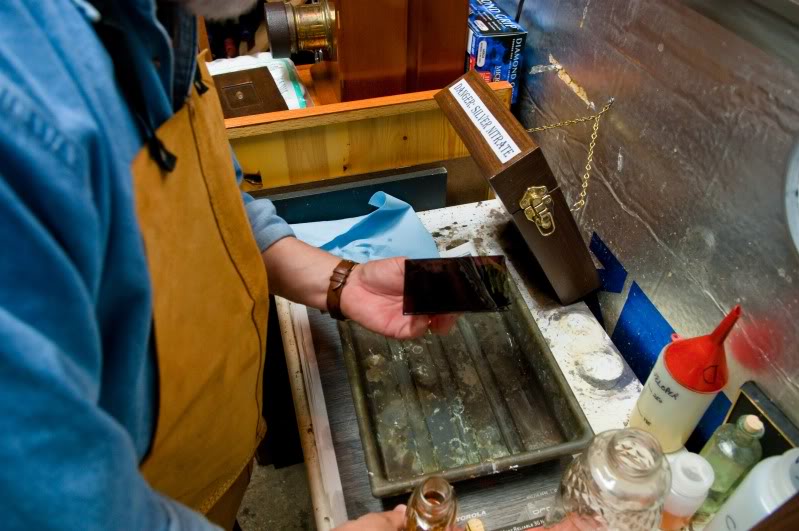 After 3 minutes in the silver nitrate solution the collodion emulsion is light sensitive so the next steps must be done under "safe light". The plate is removed from the solution and while still wet it is inserted into a plate holder, then taken to the camera. Prior to making a plate, a pose is set up. When it is time to take the picture last minute adjustments and refocusing is done to ensure everything is correctly arranged, then the lens cap is removed to make an exposure of 3-6 seconds to "strike" the image.