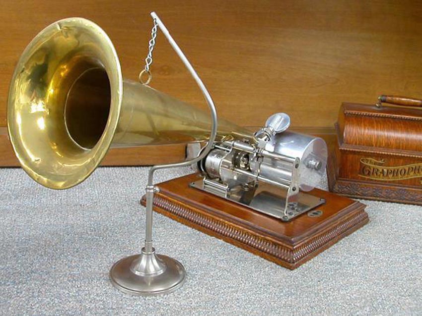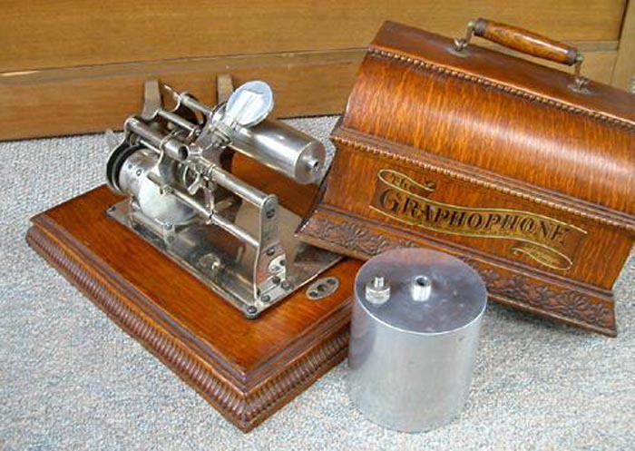 This variation of the famous Model B Graphophone shares the same tiny open works motor, upscaled to play the large 5" diameter Concert or Grand cylinders that had come on the market around 1898. However, the AB can also play conventional 2" cylinders by unscrewing the knurled nut, removing the 5" Concert mandrel, and raising the telescoping interior 2" mandrel to reach the reproducer. (See also the Columbia Type AD.) At $25 this was the cheapest machine made which could play the soon-to-become obsolete Concert records, which had dropped in price from $5 each to $1 apiece -- still a considerable sum for the time. (This phonograph was the third I ever bought, back in 1962!)