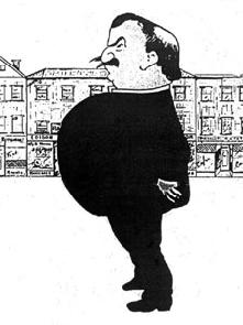 Peter Bacigalupi as caricatured in Talking Machine World, and pictured on a contemporary pin-back button.
