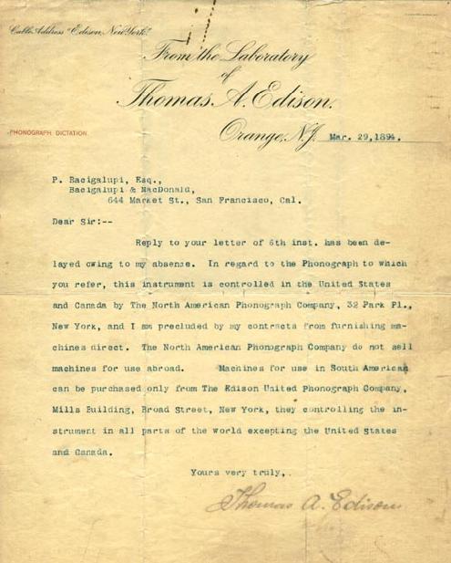 Returning to San Francisco a few months later, Peter Bacigalupi wrote to Thomas Edison