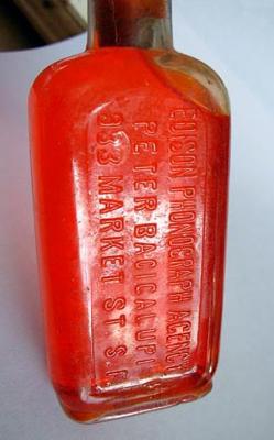 Bacigalupi pasted his own labels on top of Edison labels on record boxes. At least 14 different variations are known. The bottle of phonograph oil has Bacigalupi's name and address embossed into the glass.