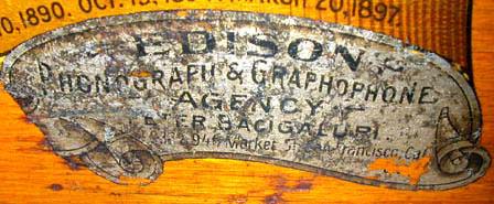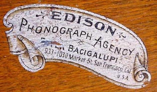 Bacigalupi dealer decals used in 1898 and later. The tag on the left lists "Edison Phonograph & Graphophone Agency." In the late 1890s Bacigalupi stopped carrying Graphophones and changed the decal to remove the term.