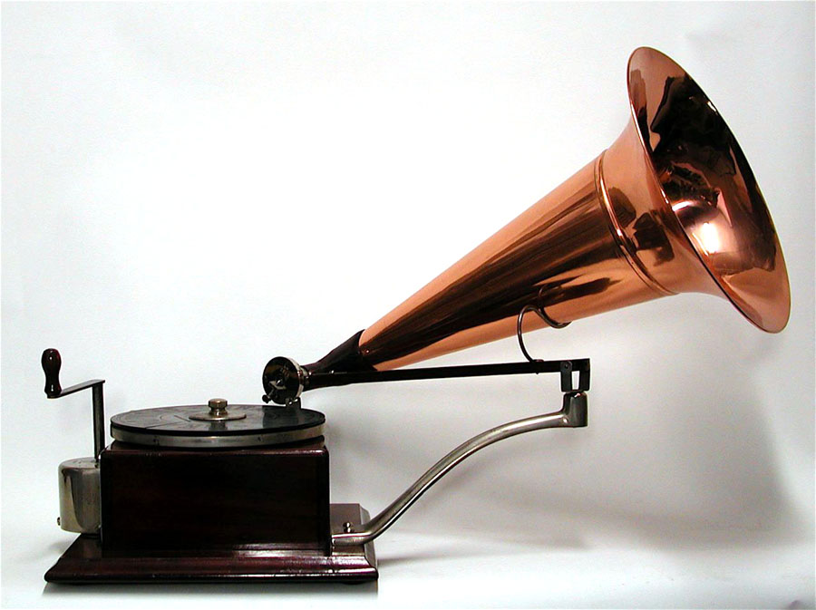 Immortalized in the painting "His Master's Voice," the Berliner 'Improved' Gramophone with its distinctive vertically-mounted crank is unquestionably the most famous phonograph in the world. The enduring image of this machine, paired with Nipper the dog in the Victor (and later RCA) trademark, gives this popular machine its nickname among today's collectors -- the Berliner Trademark. Originally offered in the U.S. in 1897, this classic style went on to be sold in Canada, England, and France up until around 1903. Only in France during the 'Belle Epoque,' however, did this classic phonograph take on an aura of true elegance, cased in dark red mahogany. Most often found with a brightly nickeled horn, some were made with a gorgeous copper horn as seen here -- infinitely richer in appearance than its more humble cousins. (Everywhere else the case was made of light oak, and the horn was either black or brass). Interestingly, the motor and reproducer were made in the United States, while the cabinet was made in England. The machine itself, however, was only marketed in France. This example of the very rare mahogany Berliner Trademark is totally original and pristine, with a highly polished finish.
