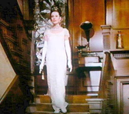 Radiantly lovely Audrey Hepburn co-stars with the Devineau Biophone in "My Fair Lady" in 1964. The phonograph is shown from the rear, fitted with a small horn.