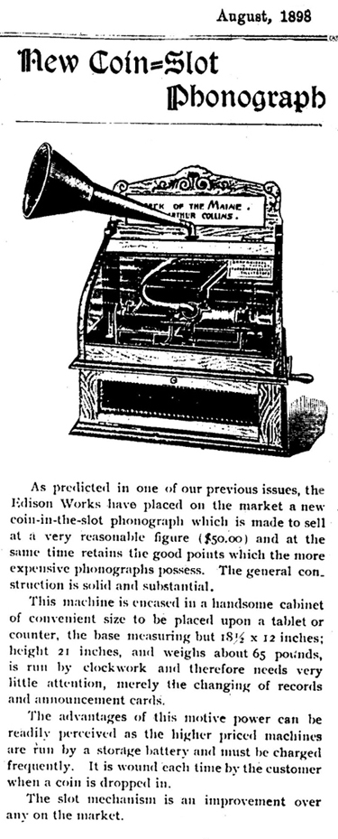 The new Edison spring-motor coin-operated phonograph was announced in the