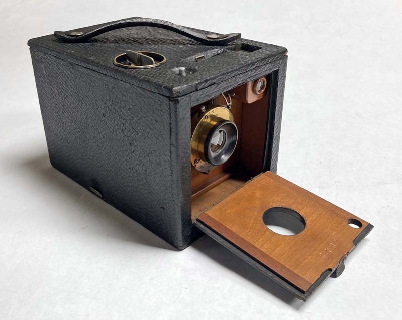 This is the upscale version of the 1898 No. 2 Bulls-Eye. Like the 1898 No. 2 Bullet Special, this has a top-quality Bausch & Lomb rapid rectilinear lens rather than the simple meniscus lens of the ordinary versions. Instead of three aperture stops, it has an iris diaphragm with a wide range of adjustments. It also has three shutter speeds in instantaneous mode. Unlike the Bullet Special, it does not have an option to accept glass plates. Originally priced at $15, it was nearly twice as expensive as the regular Bull's-Eye. According to factory records, the serial number dates this example to June of 1898. In total, 17,000 were made in three different models: 1898 Model, 1899 Model, and Model C (from 1900-1904).