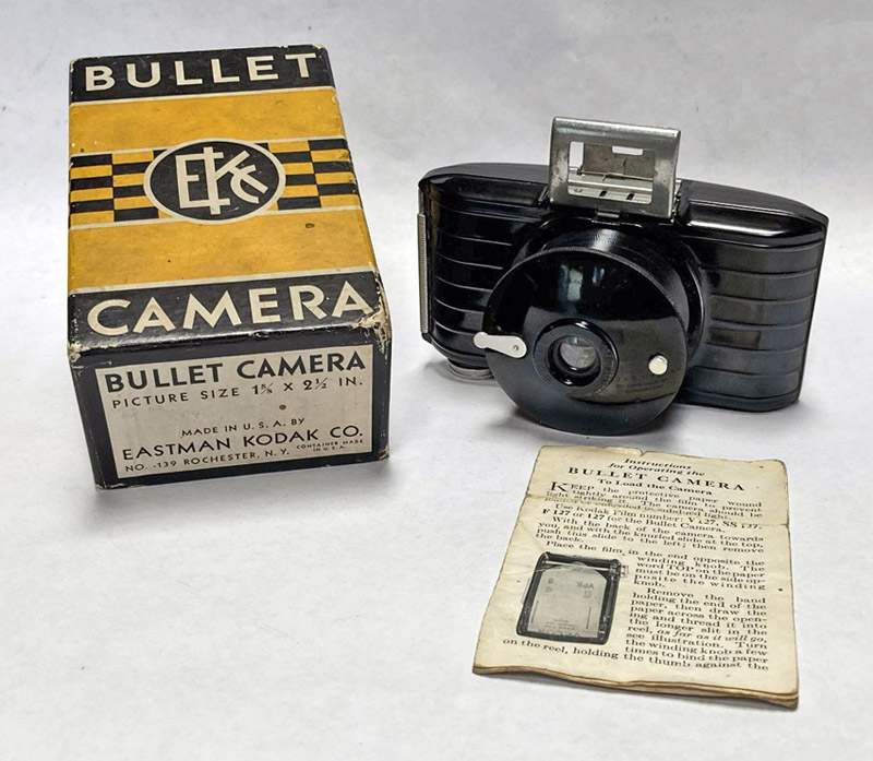 Like the Beau Brownie and the Jiffy VP, the Bullet was designed by the legendary Walter Dorwin Teague, styled in a very Streamline Moderne style. It is made of molded Bakelite, with a horizontal striped pattern. The lens assembly has a helical thread that unscrews to extend the lens from the body. It uses 127 film, yielding 8 images measuring 1-5/8” x 2-1/2”. This camera is in near-mint condition, complete with its original cardboard box and instruction manual.