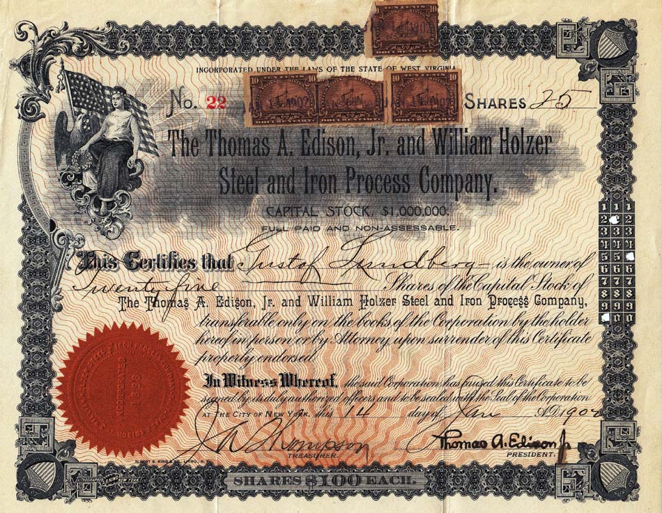 One of the few inventive ideas of Tom Junior which actually held some merit was a method of steel processing that he developed with his uncle, William Holzer, who was married to the sister of Edison senior's first wife. Holzer had worked for Edison in the Menlo Park laboratory 20 years earlier, and it is questionable whether Edison Jr. or Holzer was the real inventor. Although Bethlehem Steel Company expressed some interest, the process was never adopted and the company collapsed in litigation. This stock certificate (signed by Tom Junior as company president) was never redeemed and the investor, who was the Danish Consul in Boston at the turn of the century, lost $2,500 -- equivalent to almost $60,000 in today's dollars.