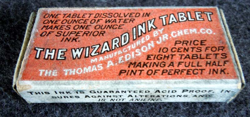 This original package of Wizard Ink Tablets is still full and complete with instructions. (However, over the last 100 years the tablets have deteriorated into powder.) Is it any good? A very tiny sample quantity proved to make good, dark, useable ink, but despite the advertising claims that "ink made from the Edison, Jr. Wizard Ink Tablet will neither sour nor mould," the ink was coated in mold in 3 days time!