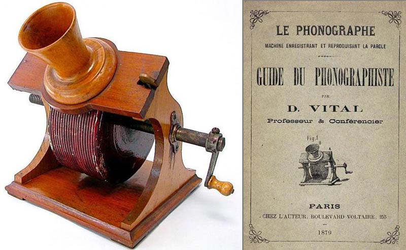 D. Vital was a professor and lecturer in Paris who manufactured phonographs in addition to putting on public exhibitions. Today he is best known for this very small machine, with a base measuring just under 6" x 6" and a mandrel only 2-1/8" wide and 4-1/4" in diameter. (Quite a contrast to the huge Kohl Exhibition tinfoil phonograph!) It is unique in that it is constructed almost entirely of wood, including the hinged speaker arm and small horn. Even more surprising is the mandrel, which is cast in plaster and painted deep maroon. Given the extreme fragility of this wood and plaster construction (compared to the typical cast iron and brass of other tinfoil phonographs) it is astonishing that any of these delicate machines have survived the past century and a quarter. Only four original Vital phonographs are known to exist today. This machine is complete with the original instruction book, the only copy believed to survive.