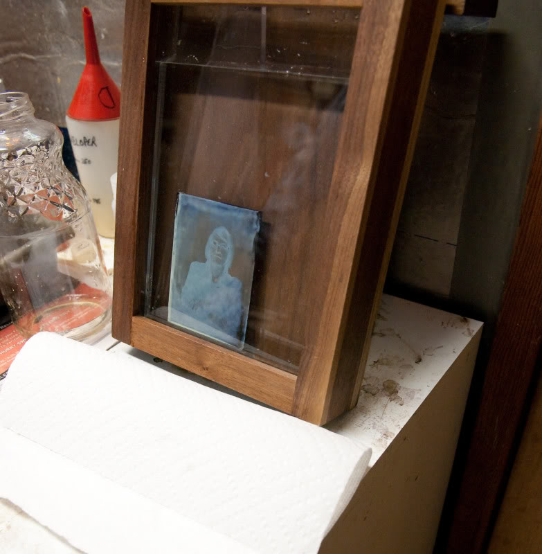 As soon as it has cleared it must be removed from the cyanide or it will begin to disintegrate. Then it is thoroughly washed in clean water and allowed to air dry. The final step is to flow sandarac varnish onto the surface to protect the silver and prevent it from tarnishing, and quickly drying the varnish over a very hot kerosene lamp -- hopefully with no dust landing smack-dab in the center of the sitter's face. Properly done, this rapid heating causes the varnish to level out and yield a smooth, hard protective coating. When using a glass substrate for an ambrotype, great care must be exercised to avoid overheating and shattering the glass. Voilà, a finished portrait: