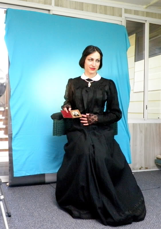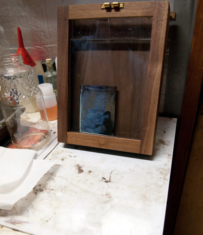 After 3 minutes in the silver nitrate solution the collodion emulsion is light sensitive so the next steps must be done under "safe light". The plate is removed from the solution and while still wet it is inserted into a plate holder, then taken to the camera. Prior to making a plate, a pose is set up. When it is time to take the picture last minute adjustments and refocusing is done to ensure everything is correctly arranged, then the lens cap is removed to make an exposure of 3-6 seconds to "strike" the image.