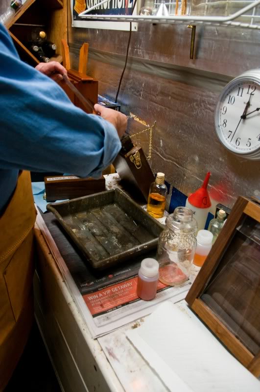 The collodion is carefully flowed over the plate, leaving a thin, perfectly even coating. (It's about 40% ether, so ventilation is important if you want to stay conscious.)